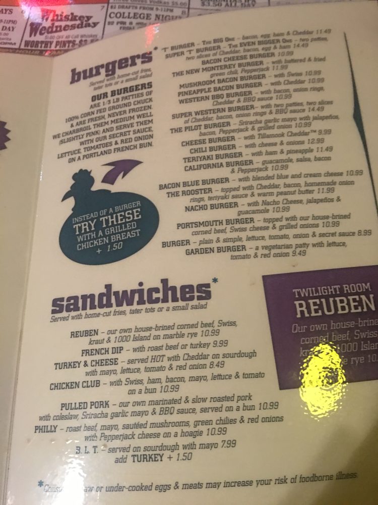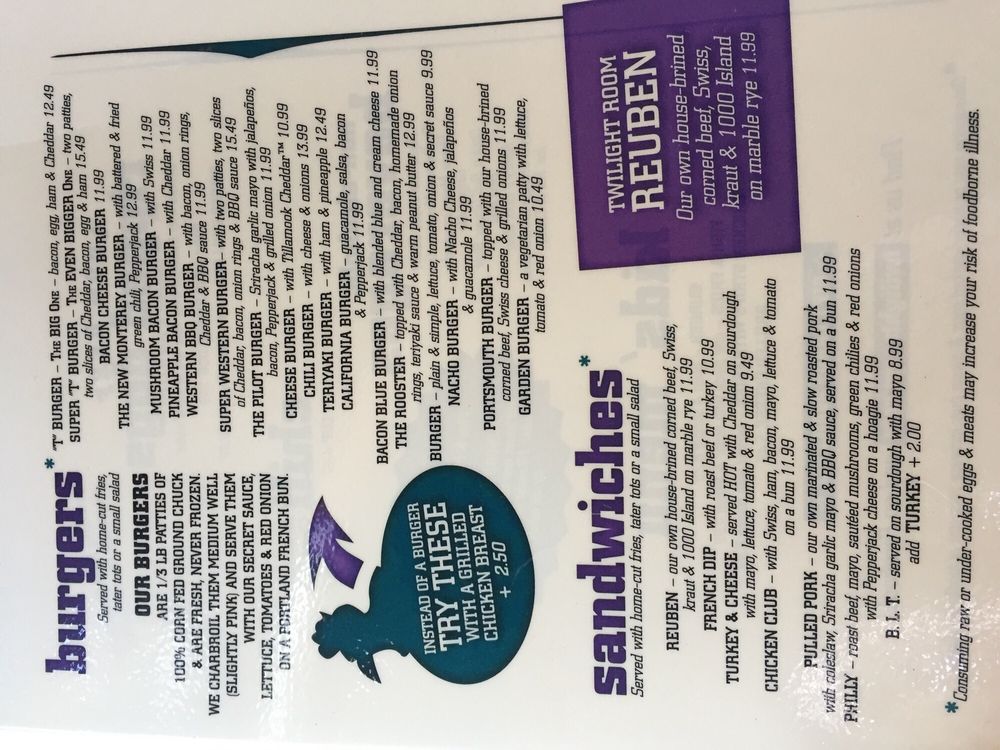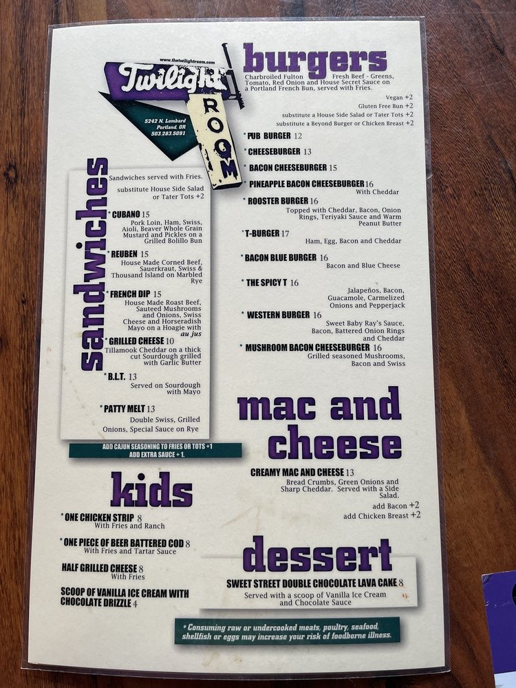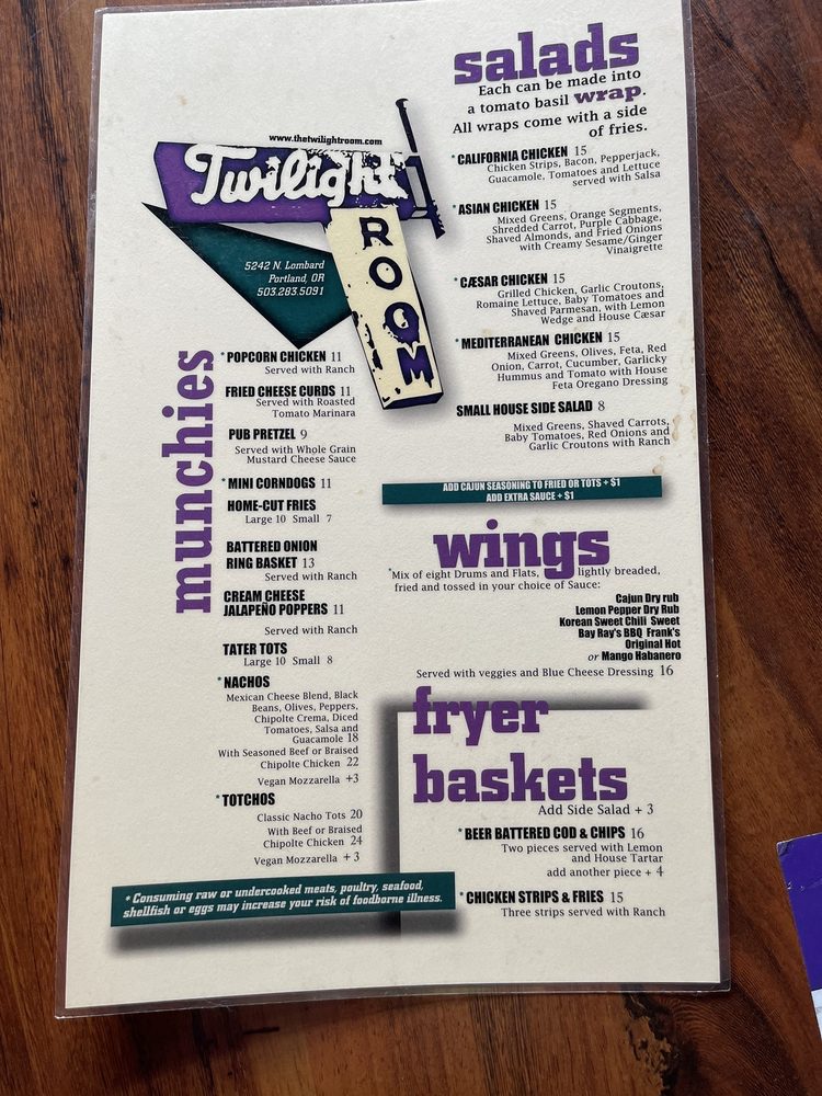 Twilight Room, located in Portland, OR, is a favorite diner known for its chill atmosphere and delicious food. The menu features options like French Dip and Pulled Pork sandwiches, a variety of salads, and mouthwatering burgers like the "T" Burger and Western BBQ Burger. Customers rave about the attentive service, spacious layout, and great drinks. With a diverse menu that includes vegetarian options, Twilight Room caters to all dietary preferences. The outdoor seating, pool table, karaoke nights, and happy hour specials make it a go-to spot for groups and late-night cravings. Whether you're looking for a casual lunch, a lively dinner, or a fun night out, Twilight Room offers something for everyone. Don't miss out on the Dad's Chicken dinner or the party melt, paired perfectly with a Guinness on tap. Experience the welcoming vibes and delicious dishes at Twilight Room today.